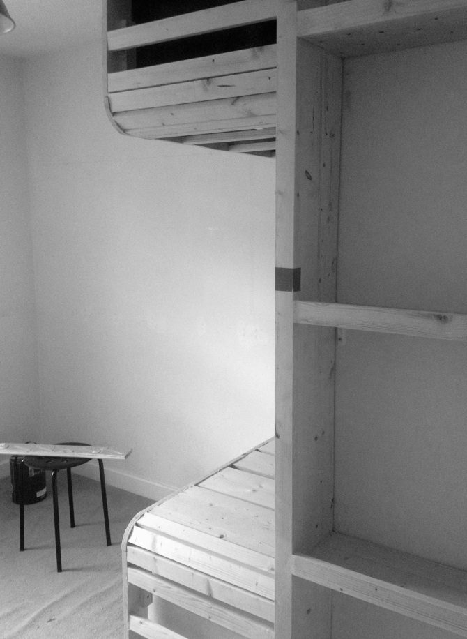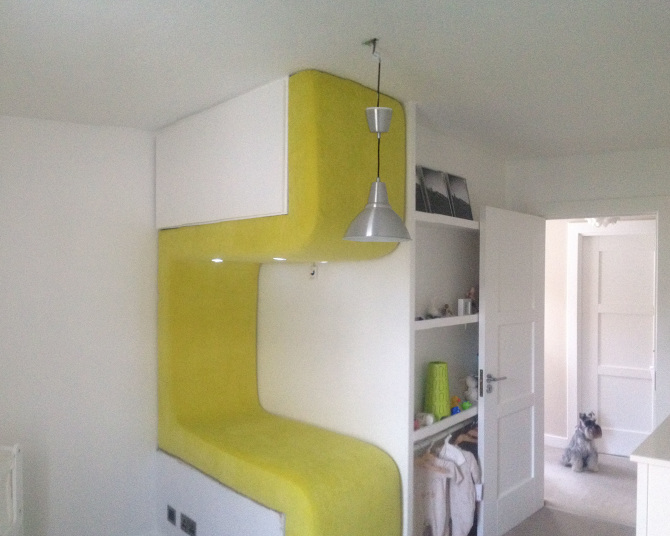 An intervention atop an existing bulkhead over a stairwell, incorporating storage and chill out seat.